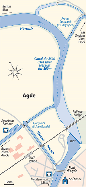 Turn south and go downstream for 800m (past possible bank-side river moorings) until within sight of the Agde weir, then turn right into the canal – high grassy banks but a timber waiting pontoon outside Agde’s ‘round lock’. Entering the river, it is possible to turn north and cruise up to Bessan (see under Hérault).