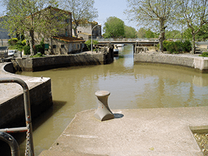 Cruise into the terminal basin and turn round to appreciate the unique view of the ‘twin bridges’.There are now three, but the name stuck. Through the right-hand bridge is the short Canal de Brienne which takes water from the Garonne behind the Bazacle weir. The middle bridge is the one you have just come through. The left-hand bridge is on the connecting Canal de Garonne (see South West France). Terrific white marble bas-relief between the first two : the Mediterranean and the Atlantic personnified together with canal building cherubs busy with picks and shovels. The turn between the two canals is quite tight; you might want to go further into the basin and take a wider approach. There are quayside moorings here, but it is bounded by busy roads.