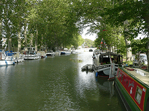A good place to moor for a day or two, nice village, excellent wine co-operative. Most moorings are bank-side but there is a public quayside with water (south bank just below the écluse – ‘jeton’ tokens from the tourist office adjacent) and also other moorings by the restaurant, north bank by the écluse. The best place is outside the friendly and very well run camp-site ‘les Berges du Canal‘ (small restaurant, bar, showers, etc), which has electricity as well as water available. Phoning ahead to reserve a mooring is advised.