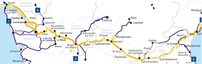 To travel between Bordeaux and Sete involves three waterways, starting with a 53km section of the Garonne River from Bordeaux to Castets-en-Dorthe. Afterwards, you follow the Canal de Garonne for 193km before arriving in Toulouse. From here, Sète is a 240km bike ride along the Canal du Midi.