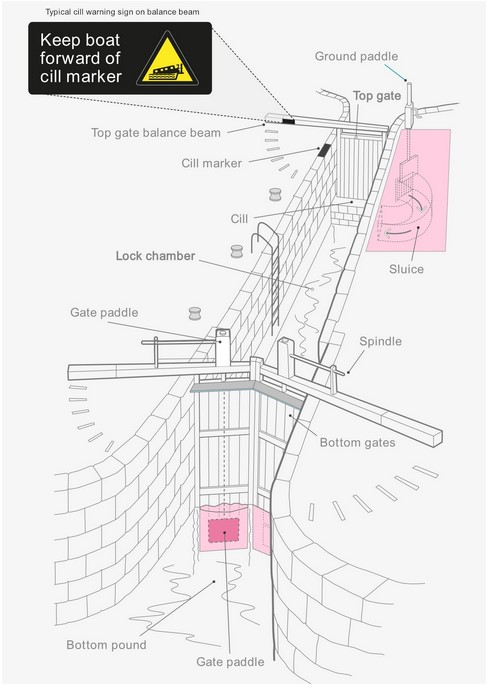 There are paddles on locks which are raised and lowered to control the water flow and alter the level. The cill is a large raised ledge at the top end of the lock which the top gate shuts against.